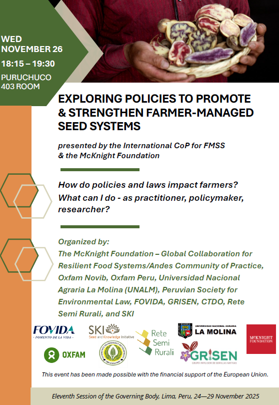 In parallel to GB11, Oxfam Novib and Oxfam Peru, together with the McKnight Foundation, CTDT, Rete Semi Rurali and other partners, are organizing a side event on policies for Farmer Managed Seed Systems. Oxfam has been coordinating the international Community of Practice (CoP) on Farmer Managed Seed Systems since its inception in Harare in November 2024. The CoP and its key members are hosting a side event, together with the McKnight Foundation in Lima to discuss in more detail FMSS best practices and experiences and explore policies to support and enable FMSS.