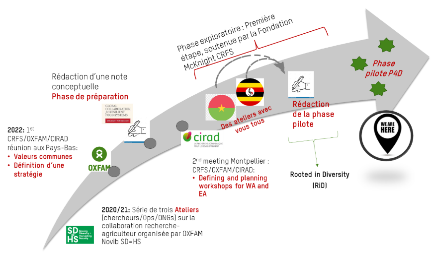 The Partnerships for Diversity (P4D) initiative is a coordination effort between CIRAD, Oxfam Novib and more than forty organizations in East and West Africa, supported by the Global Collaboration for Resilient Food Systems (CRFS) program of the McKnight Foundation. It aims at testing innovative collaboration models and tools for scaling equitable partnerships between farmers and researchers. A special focus of the initiative is on agrobiodiversity and farmer managed seed systems, and on how these can foster the agroecological transition and ultimately support long-term resilience for smallholder farmers.